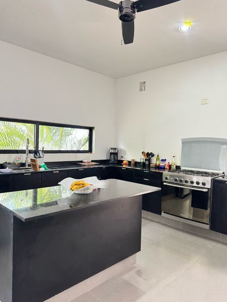 Cocina equipada e isla al centro y barras de granito.