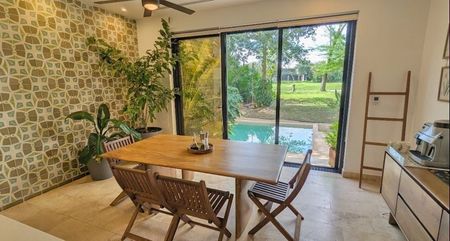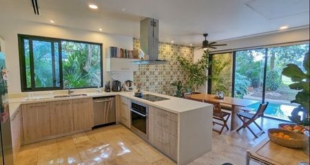 - Cocina integral en concepto independiente con barra desayunador, alacena y ante comedor con vista a la piscina y campo de golf