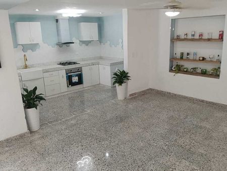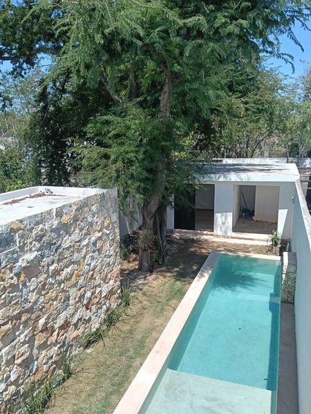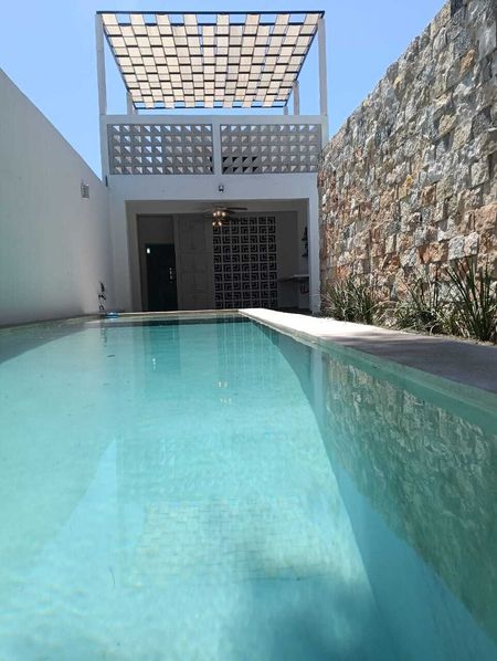 En el primer nivel encontramos una cochera para un vehículo, sala - comedor corrido, cocina integral, recamara principal, terraza con alberca, amplio cuarto de usos múltiples(lavado o bodega) y una pequeña casa de huéspedes al fondo del