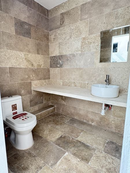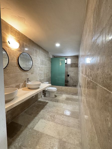En el primer nivel encontramos una cochera para un vehículo, sala - comedor corrido, cocina integral, recamara principal, terraza con alberca, amplio cuarto de usos múltiples(lavado o bodega) y una pequeña casa de huéspedes al fondo del
