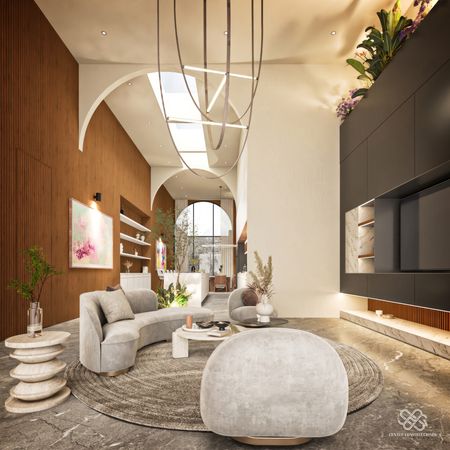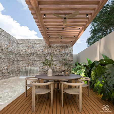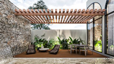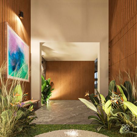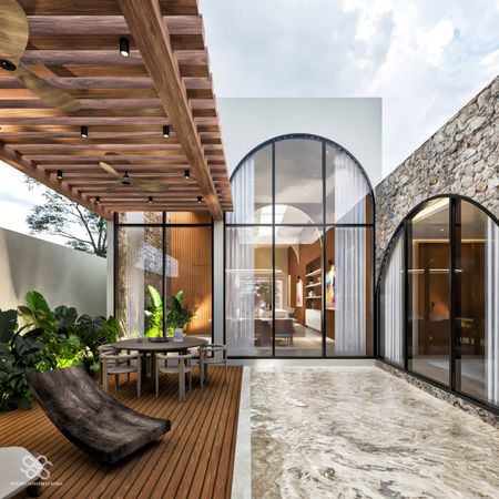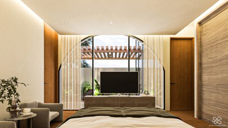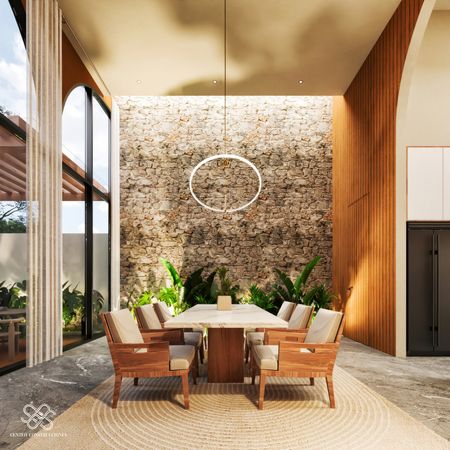 La residencia se diferencia de las demás por un diseño arquitectónico contemporáneo con toques mediterráneos se distingue por su estilo Wabi Sabi con dobles alturas, pronunciadas curvas ,acabados en chukum , piedra natural y amplias jardineras que dan vida y un estilo único a la fachada e interiores, además de ser un Smart Home controlada desde la app de tu teléfono.