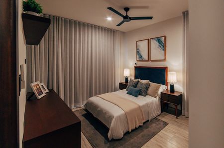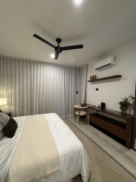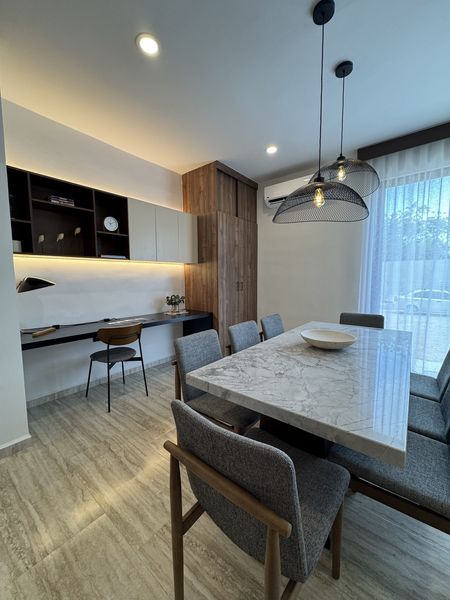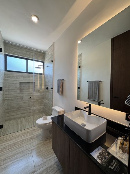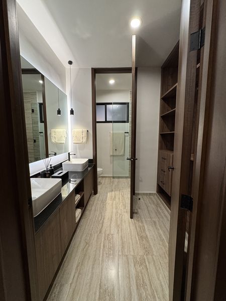 ● Equipamiento: Meseta de granito en cocina, meseta de granito en baños, apagadores inteligentes en pasillo y recámaras, cerradura digital, calentador eléctrico, cristal templado en baños con puerta, closets vestidos, gabinetes inferiores y superiores en cocina, gabinetes inferiores en baños, parrilla eléctrica de inducción, campana, espejos en baños, accesorios en baño.