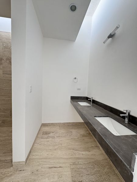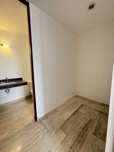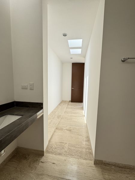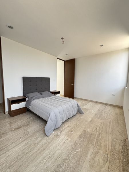 Recámara principal con clóset vestidor, baño completo con doble lavabo y balcón